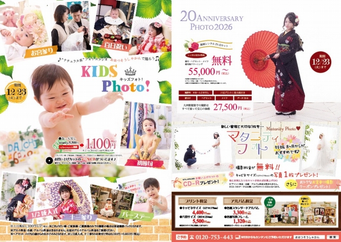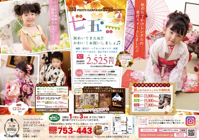 七五三/お宮参り/入園・入学/成人式の記念写真はフォトスタジオ大津創寫舘(おおつそうしゃかん)へ!!