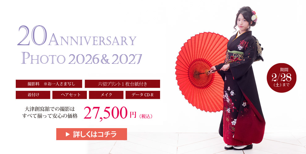 感謝の気持ちをこめまして、撮影料金が5,800(六切プリント1枚・着付・ヘアセット・メイク付)で通常より3,000OFFでオトクに撮影ができます!今ならWEB予約で洋装のお写真(2Lサイズ)も無料プレゼント中!!この機会をお見逃しなく!!